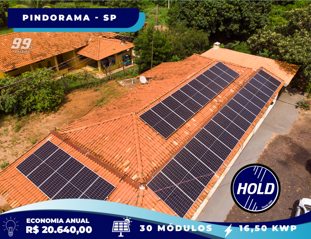 Transformamos o Sítio Santa Olga, em Pindorama-SP, com 30 módulos solares e 16,50 kWp de potência! Agora, são 2.000 kWh/mês e 24.000 kWh/ano, garantindo uma economia média de R$ 20.640/ano!
