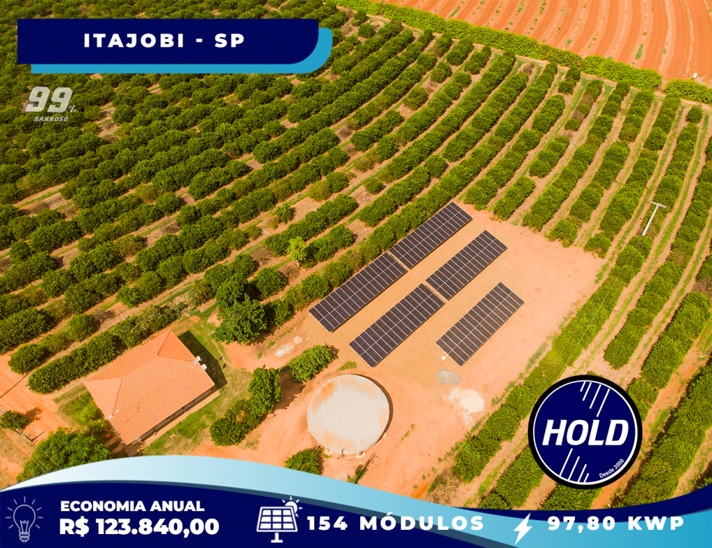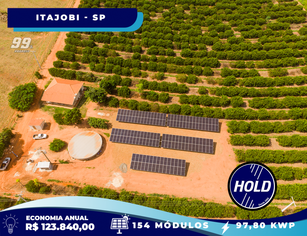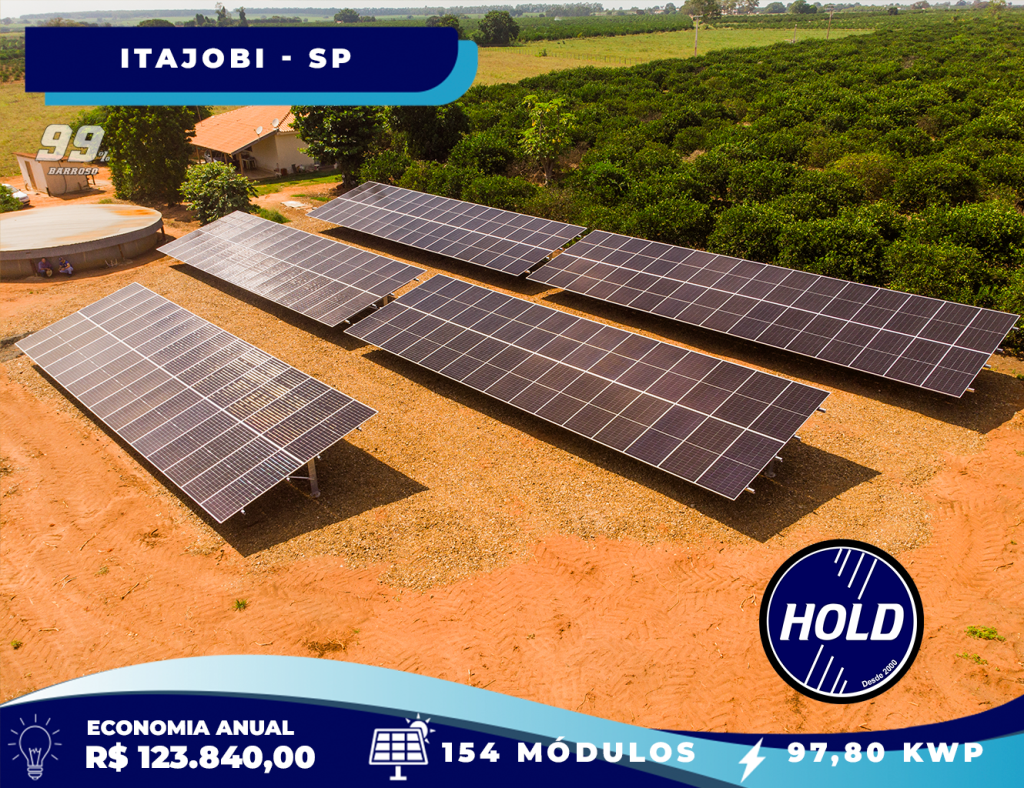 Apresentamos mais uma grande realização da Hold Energia Solar! No Sítio São Pedro, em Itajobi-SP, instalamos uma usina fotovoltaica com 154 módulos, totalizando 97,79 kWp de potência.